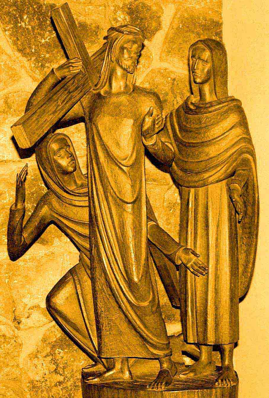 26 As they led him away, they seized a man, Simon of Cyrene, who was coming from the country, and they laid the cross on him, and made him carry it behind Jesus. 27A great number of the people followed him, and among them were women who were beating their breasts and wailing for him. 28But Jesus turned to them and said, ‘Daughters of Jerusalem, do not weep for me, but weep for yourselves and for your children. 29For the days are surely coming when they will say, “Blessed are the barren, and the wombs that never bore, and the breasts that never nursed.” 30Then they will begin to say to the mountains, “Fall on us”; and to the hills, “Cover us.” 31For if they do this when the wood is green, what will happen when it is dry?’