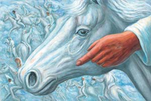 The clues to the meaning of this passage are in the “sharp sword” and the “wine press”. The sword represents the sharpness of God’s word and the wine press is used in the New Testament as a symbol of Christ’s crucifixion (“I have trodden the winepress alone”) The rider is Christ and he conquers by his truth and suffering love, as he always has done. The method of battle does not change, but in the end-time his victory-and that of his followers- will no longer be hidden. They will rule the earth by truth and love. The warlike trappings of the vision are there to represent the devastating power of truth and love which expose evil, and before which even death is abolished.