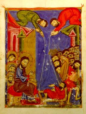 - 2When he returned to Capernaum after some days, it was reported that he was at home.2So many gathered around that there was no longer room for them, not even in front of the door; and he was speaking the word to them.3Then some people* came, bringing to him a paralysed man, carried by four of them.4And when they could not bring him to Jesus because of the crowd, they removed the roof above him; and after having dug through it, they let down the mat on which the paralytic lay.5When Jesus saw their faith, he said to the paralytic, ‘Son, your sins are forgiven.’6Now some of the scribes were sitting there, questioning in their hearts,7‘Why does this fellow speak in this way? It is blasphemy! Who can forgive sins but God alone?’8At once Jesus perceived in his spirit that they were discussing these questions among themselves; and he said to them, ‘Why do you raise such questions in your hearts?9Which is easier, to say to the paralytic, “Your sins are forgiven”, or to say, “Stand up and take your mat and walk”?10But so that you may know that the Son of Man has authority on earth to forgive sins’—he said to the paralytic—11‘I say to you, stand up, take your mat and go to your home.’12And he stood up, and immediately took the mat and went out before all of them; so that they were all amazed and glorified God, saying, ‘We have never seen anything like this!’breaking into God’s house.
