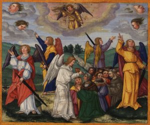 7After this I saw four angels standing at the four corners of the earth, holding back the four winds of the earth so that no wind could blow on earth or sea or against any tree.2I saw another angel ascending from the rising of the sun, having the seal of the living God, and he called with a loud voice to the four angels who had been given power to damage earth and sea,3saying, ‘Do not damage the earth or the sea or the trees, until we have marked the servants* of our God with a seal on their foreheads.’