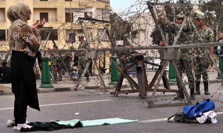 A Egyptian woman prays in front of security forces
