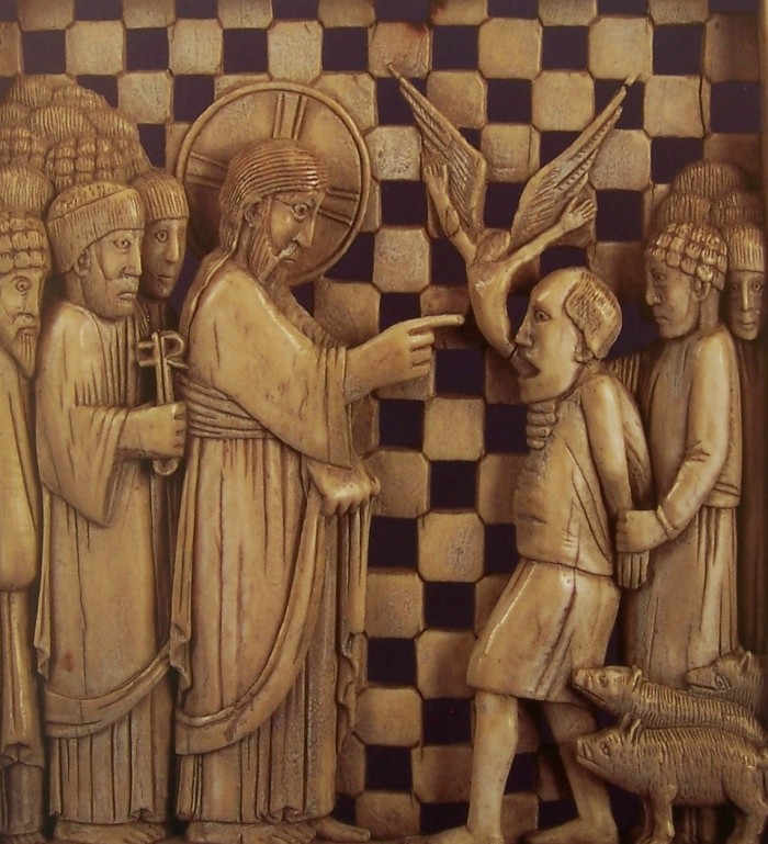 I think the original, political edge of this story survives in Mark’s version but not in Luke, whose view of the Roman Empire is more positive. Luke wants the reader to see the parallels with the immediately preceding story of the storm on the Lake and to interpret the man’s possession as an irruption of the same powers of chaos rebuked by Jesus on the boat. The calm which Jesus brings to the man is the same as the calm he creates on the Lake.